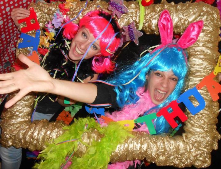 Wow! Alsof er een regenboog is geëxplodeerd vandaag! Vandaag wordt een FEEST met hoofdletters! Na de taart + cocktail 0%, Tijd om de verkleedkist in te duiken! Nadat iedereen is omgetoverd kan het feest beginnen! vol vrolijke gekke spelopdrachten (o.a. Twister XL) en tot slot de knallende disco + ballonfiguur. Confetti vliegt om je oren.. en ze zullen ons een straat verder kunnen horen!